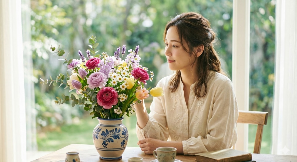「美しい女性と花」 と