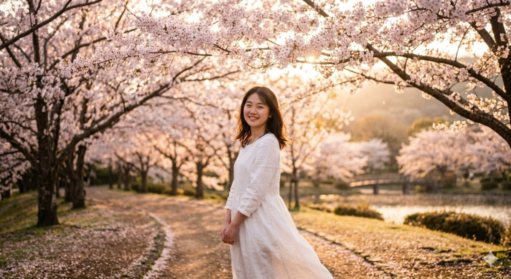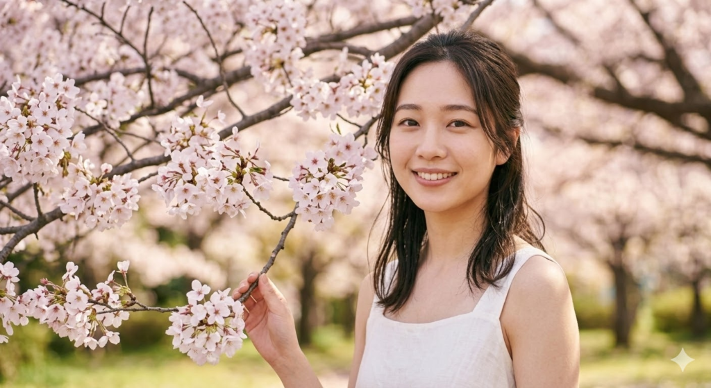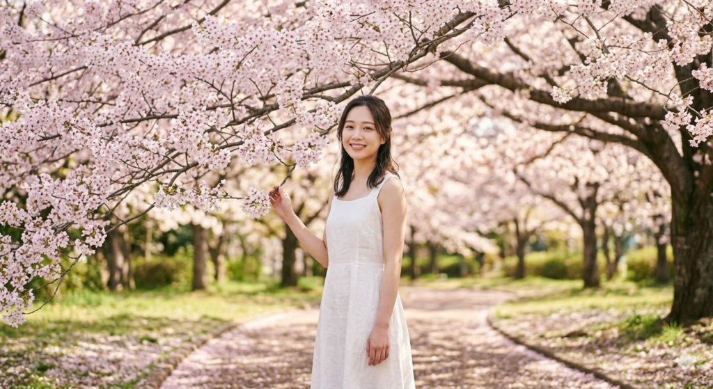 「10代の日本人女性 桜の木の下で微笑んでいる 白いリネンのワンピース」