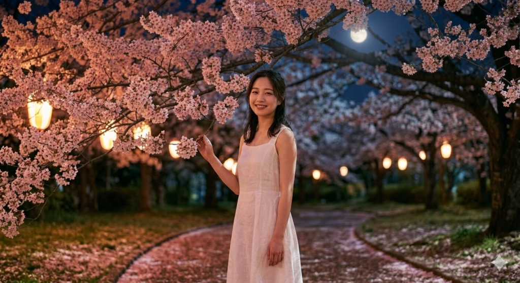 ▼「夜桜、月明かりな時間」と書くと